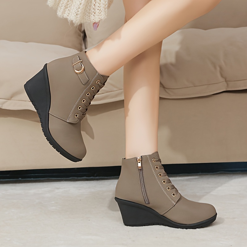Classic Solid Color, Lace-Up Women's Ankle Boots with High Platform Heels, Convenient Side Zipper, and Retro Buckle - Durable Faux Leather, Versatile and Stylish