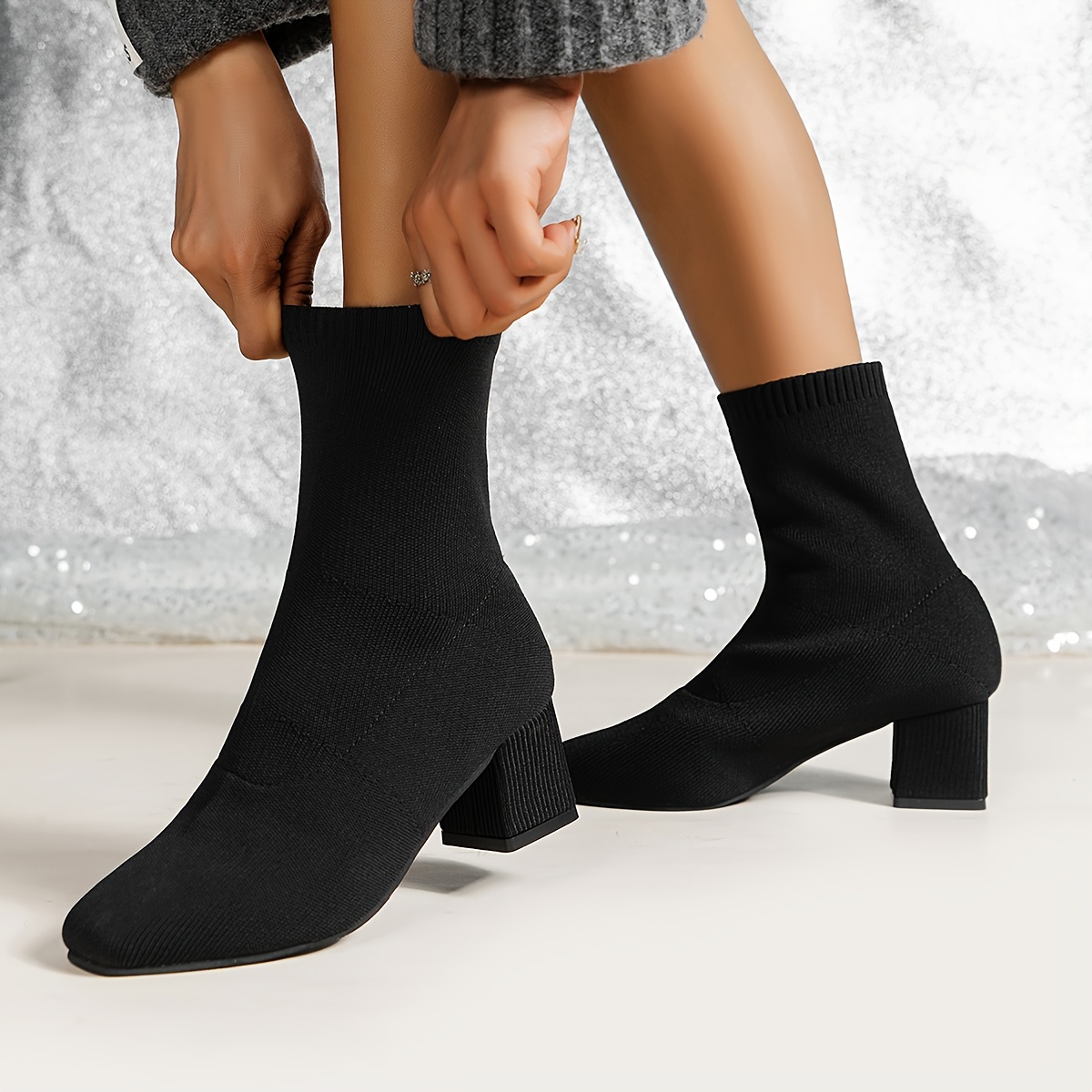 Women's Solid Color Minimalist Boots, Slip On Comfy Chunky Heel Knitted Boots, Trendy Round Toe Elastic Slim Boots